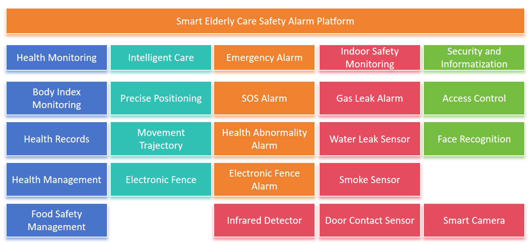 Based on ICT technologies such as the Internet of Things (IoT), big data, and artificial intelligence (AI), this project integrates health detection systems, intelligent care systems, emergency alarm systems, indoor safety monitoring systems, as well as security and information systems to build a one-stop health management and assistance service platform for homebound elderly. With smart wearable devices as the foundation, it integrates multiple types of equipment to monitor various physiological states. By integrating clinical data from both traditional Chinese medicine (TCM) and Western medicine with health big data, and utilizing AI algorithms, it calculates users' abnormal health conditions, enabling the detection of abnormalities and the delivery of early warning and assistance at the earliest possible time.