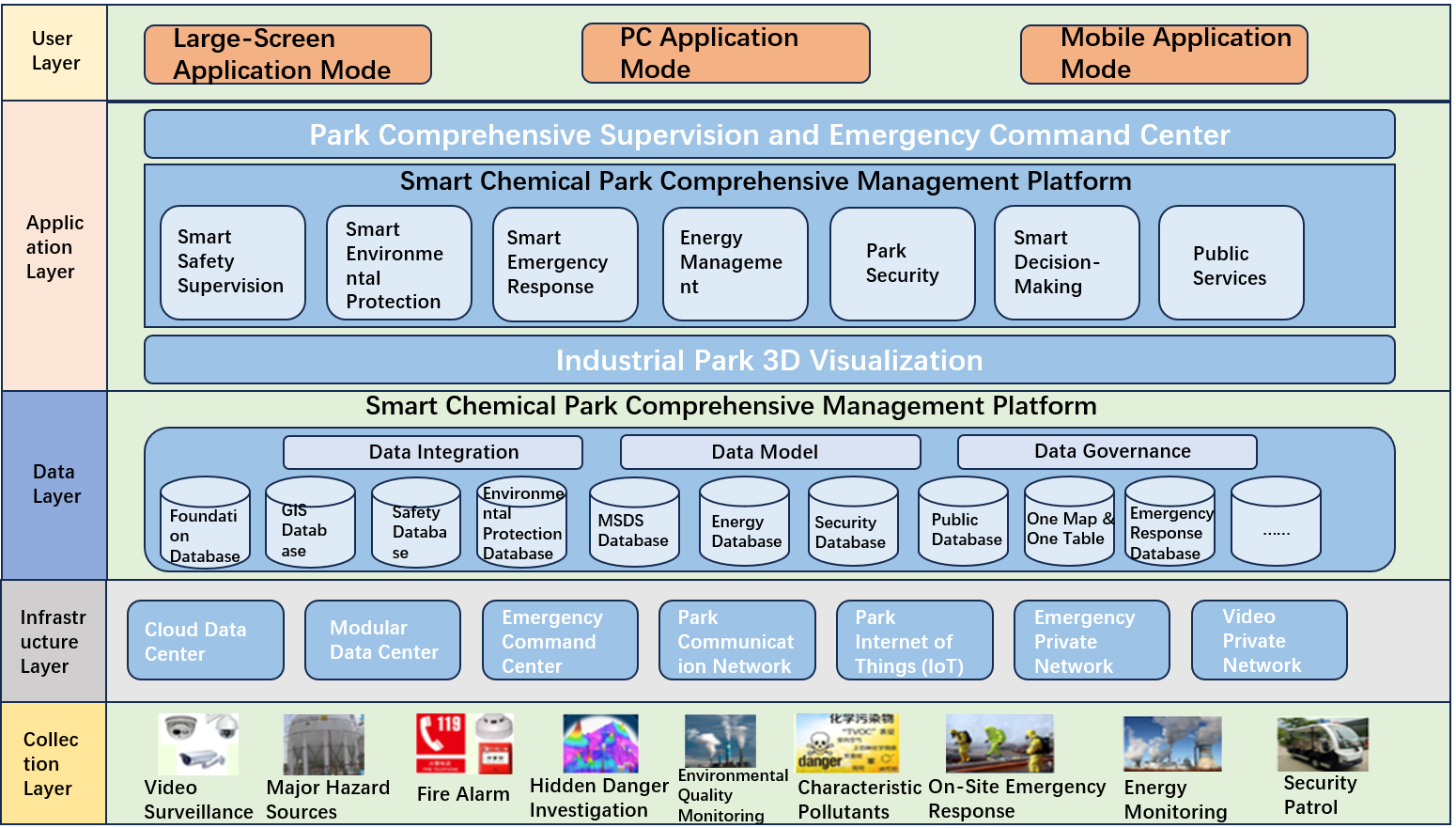 Based on the Gelite G-SES® Cloud Platform and the "Smart Park" concept, we leverage cutting-edge ICT technologies including the Internet of Things (IoT), cloud computing, big data, artificial intelligence (AI), and converged communications. By integrating integrated monitoring & early warning systems, integrated safety systems, integrated environmental protection systems, multi-source data acquisition gateways, GIS geographic information service systems, and integrated emergency command systems, we establish an integrated monitoring, early warning, and governance platform covering safety, environmental protection, production, security, logistics, facilities & equipment, and emergency rescue. This solution enhances the park’s comprehensive operation and management system for integrated safety, environmental protection, emergency response, and services. It enables real-time visualization of dynamic data related to park safety, environmental protection, production, public security, and emergency rescue on digital maps. Through "One Map for Safety Supervision", "One Map for Environmental Supervision", "One Map for Energy Supervision", "One Map for Security Prevention & Control", "One Map for Economic Operation", and "One Map for Emergency Linkage", the classified and hierarchical management status of the park is intuitively presented. The platform boosts internal government affairs management capabilities and cross-departmental business collaboration, realizing the optimization of infrastructure, refinement of operation management, informatization of functional services, and intellectualization of industrial development. Our ultimate goal is to build a "safe, innovative, green, smart, and coordinated" intelligent park.
